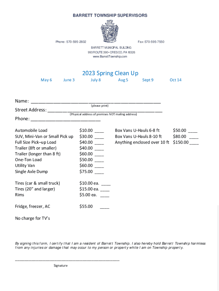 BARRETT TOWNSHIP SUPERVISORSPhone: 5705952602Fax: 5705957550 BARRETT MUNICIPAL BUILDING 993 ROUTE 390 CRESCO, PA 18326 www.BarrettTownship.comMay 6June 32023 Spring Clean Up July 8Aug 5Sept 9Oct 14Name: