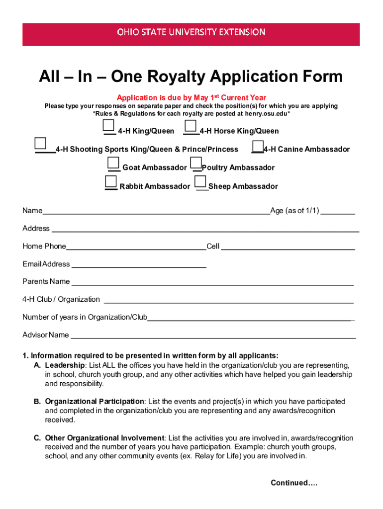 All In One Royalty Application Form Application is due by May 1st Current YearPlease type your responses on separate paper and check the position(s) for which you are applying *Rules & Regulations