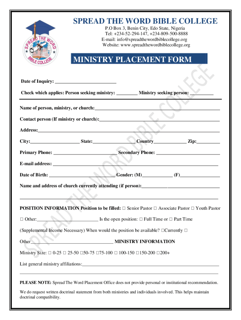 SPREAD THE WORD BIBLE COLLEGE P.O Box 3, Benin City, Edo State, Nigeria Tel: +23452294147, +2348095008888 Email: info@spreadthewordbiblecollege.org Website: www.spreadthewordbiblecollege.orgMINISTRY