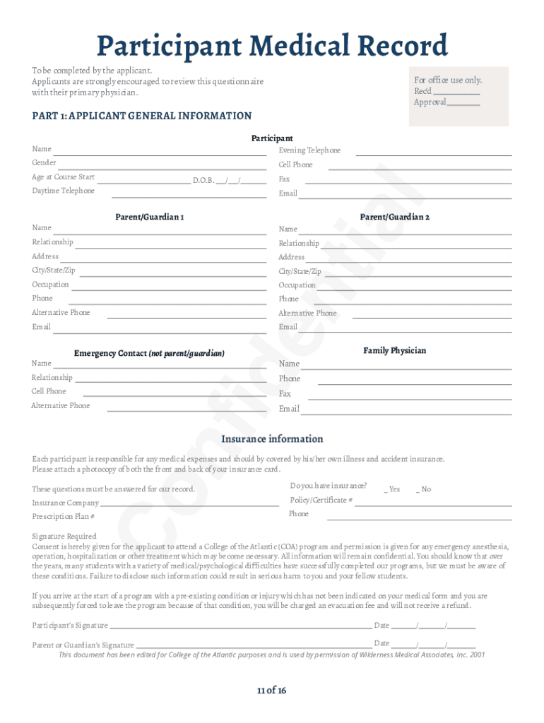 Participant Medical RecordTo be completed by the applicant. Applicants are strongly encouraged to review this questionnaire with their primary physician.PART 1: APPLICANT GENERAL INFORMATION ParticipantEvening
