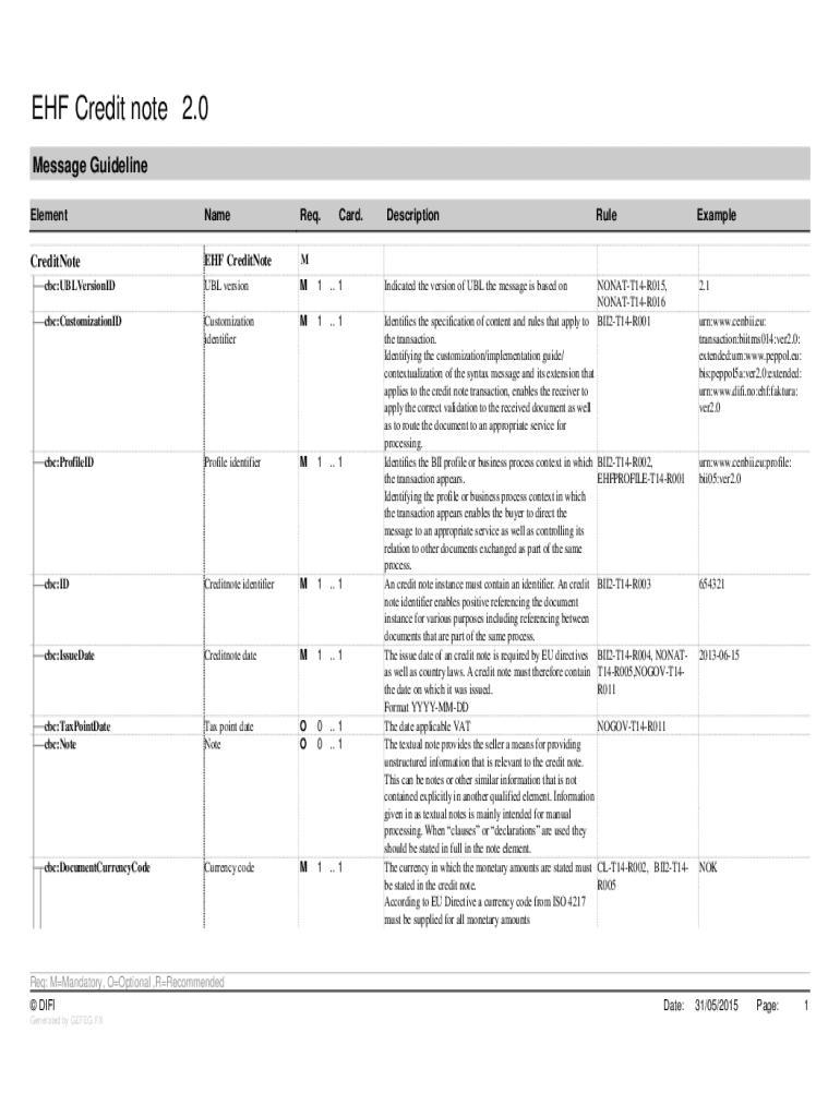 EHF Credit note 2.0 Message Guideline ElementNameCreditNoteReq.Card.EHF CreditNoteMcbc:UBLVersionIDUBL versionM1 .. 1cbc:CustomizationIDCustomization identifierM1 .. 1cbc:ProfileIDProfile identifierM1