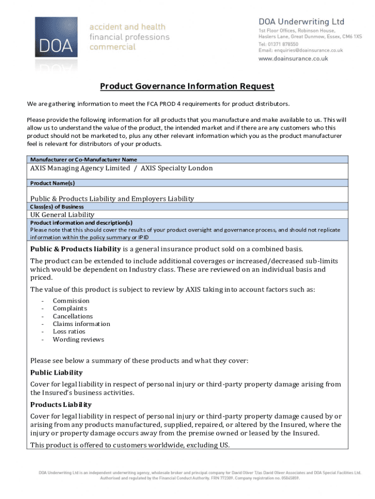Product Governance Information Request We are gathering information to meet the FCA PROD 4 requirements for product distributors. Please provide the following information for all products that you