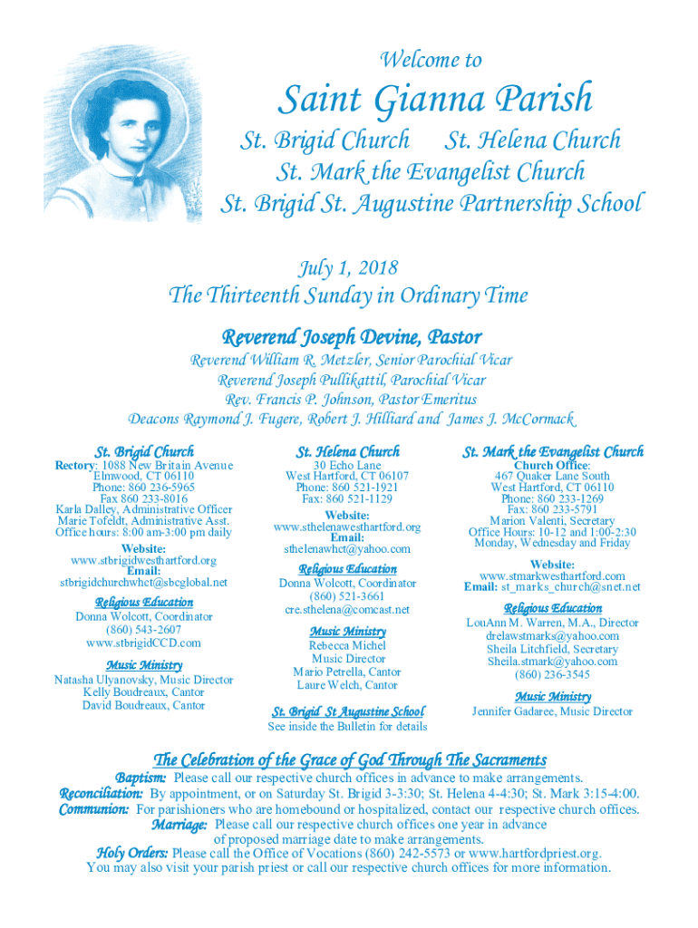 Welcome toSaint Gianna Parish St. Brigid Church St. Helena Church St. Mark the Evangelist Church St. Brigid St. Augustine Partnership School July 1, 2018The Thirteenth Sunday in Ordinary Time Reverend
