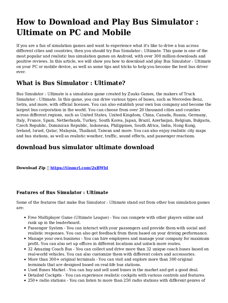 How to Download and Play Bus Simulator : Ultimate on PC and Mobile If you are a fan of simulation games and want to experience what it\'s like to drive a bus across different cities and countries,