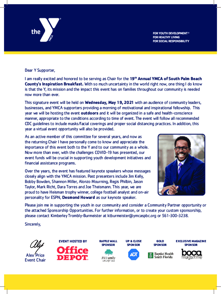 Dear Y Supporter, I am really excited and honored to be serving as Chair for the 19th Annual YMCA of South Palm Beach Countys Inspiration Breakfast. With so much uncertainty in the world right now,