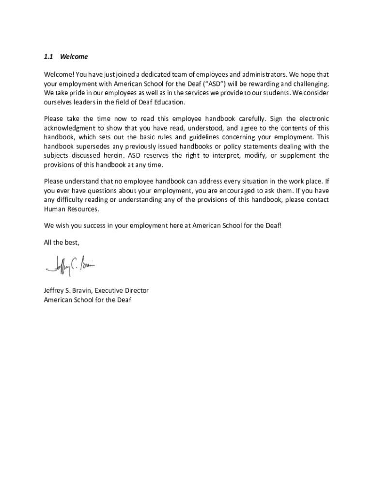 1.1 Welcome Welcome! You have just joined a dedicated team of employees and administrators. We hope that your employment with American School for the Deaf (ASD) will be rewarding and challenging.