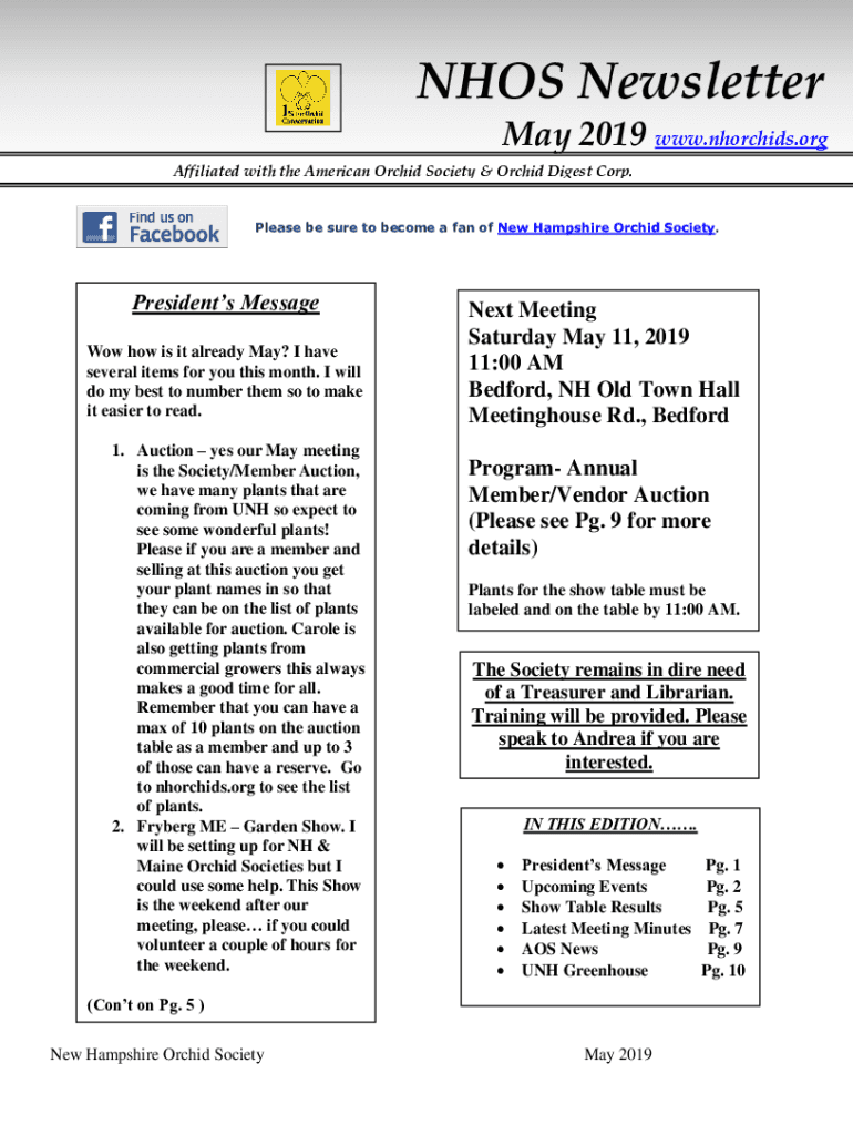 NHOS Newsletter May 2019 www.nhorchids.orgPlease be sure to become a fan of New Hampshire Orchid Society.Affiliated with the American Orchid Society & Orchid Digest Corp.February 2015Please be sure
