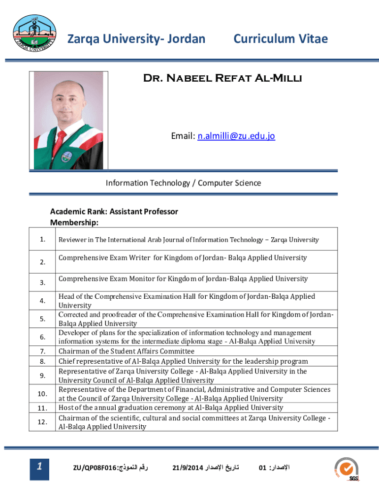Zarqa University JordanCurriculum VitaeDr. Nabeel Refat AlMilliEmail: n.almilli@zu.edu.joInformation Technology / Computer Science Academic Rank: Assistant Professor Membership: 1. 2. 3. 4. 5. 6.