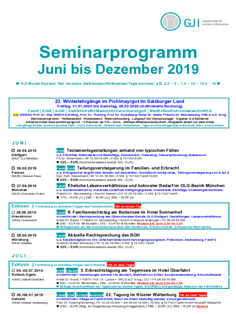 Seminarprogramm Juni bis Dezember 2019n GJIModulSystem: Nur einzelne Zeitstunden/Referenten/Tage buchbar, z.B. 2,5 5 7,5 10 12,5 15 n23. Winterlehrgnge im Pichlmayrgut im Salzburger Land Freitag,