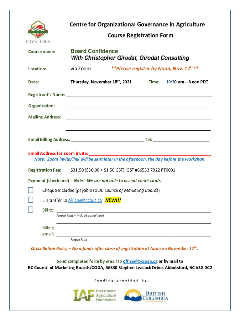 Centre for Organizational Governance in Agriculture Course Registration Form Course name:Board Confidence With Christopher Girodat, Girodat ConsultingLocation:via ZoomDate:Thursday, November 18th,