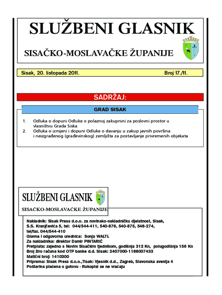 SLUBENI GLASNIK SISAKOMOSLAVAKE UPANIJE Sisak, 20. listopada 2011.Broj 17./11.SADRAJ: GRAD SISAK 1.2.Odluka o dopuni Odluke o polaznoj zakupnini za poslovni prostor u vlasnitvu Grada Siska Odluka