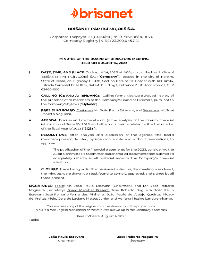 BRISANET PARTICIPAES S.A. Corporate Taxpayer ID (CNPJ/MF) n 19.796.586/000170 Company Registry (NIRE) 23.300.045.742MINUTES OF THE BOARD OF DIRECTORS MEETING HELD ON AUGUST 14, 2023 1DATE, TIME, AND