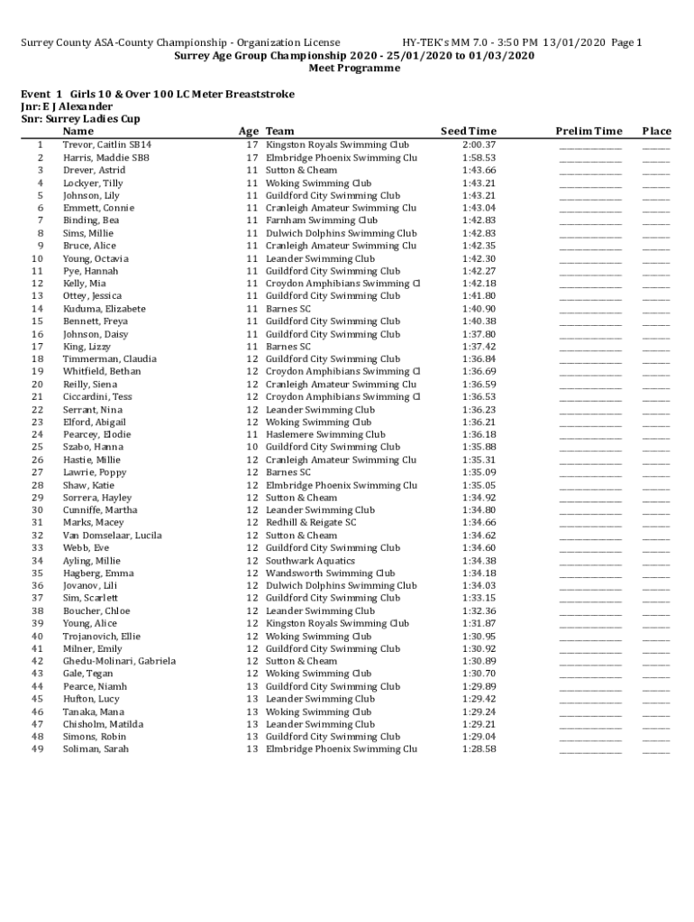 Surrey County ASACounty Championship Organization License HYTEK\'s MM 7.0 3:50 PM 13/01/2020 Page 1 Surrey Age Group Championship 2020 25/01/2020 to 01/03/2020 Meet Programme Event 1 Girls 10 & Over