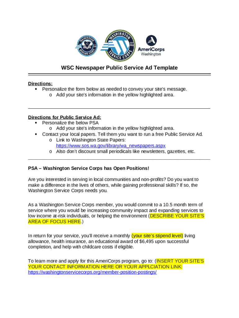 The WSC Newspaper Public Service Ad Template is a Word document which can be filled-out and signed for certain purposes. In that case, it is furnished to the relevant addressee to provide certain info and data. The completion and signing is available manually in hard copy or with a suitable solution like PDFfiller. These services help to submit any PDF or Word file without printing them out. It also allows you to edit its appearance according to your needs and put an official legal digital signature. Once done, the user ought to send the WSC Newspaper Public Service Ad Template to the recipient or several ones by email and also fax. PDFfiller includes a feature and options that make your Word template printable. It includes various options when printing out. No matter, how you send a form - physically or electronically - it will always look well-designed and organized. To not to create a new file from scratch all the time, turn the original form into a template. Later, you will have an editable sample.