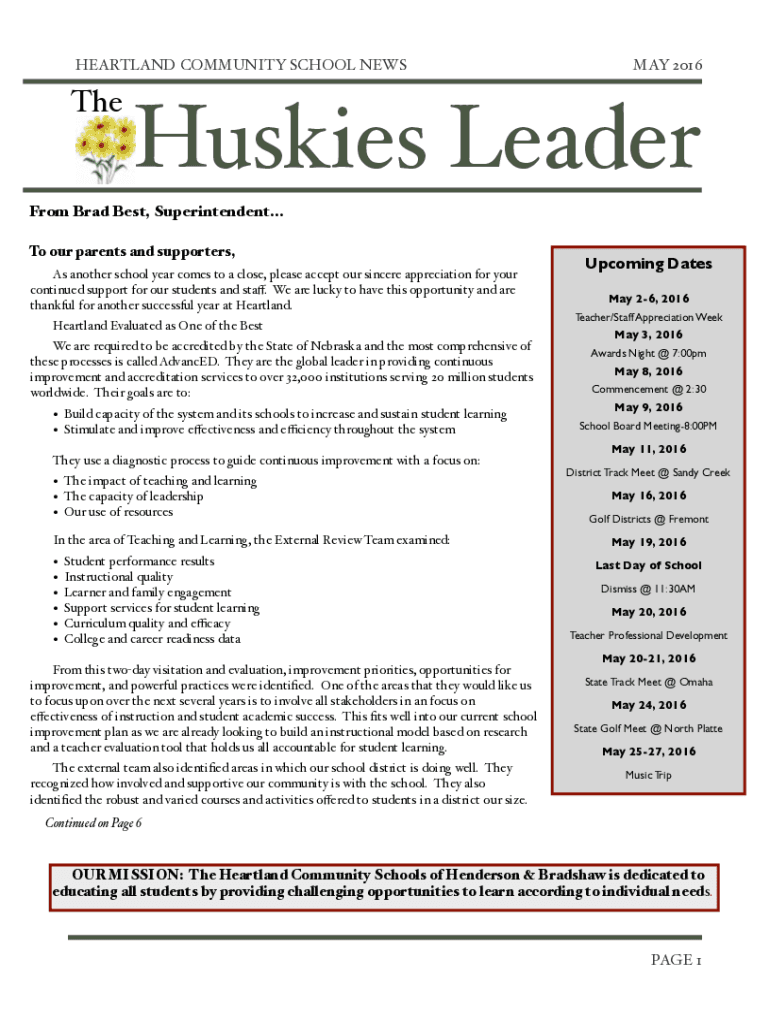 HEARTLAND COMMUNITY SCHOOL NEWS!TheMAY 2016Huskies LeaderFrom Brad Best, Superintendent... To our parents and supporters, As another school year comes to a close, please accept our sincere appreciation