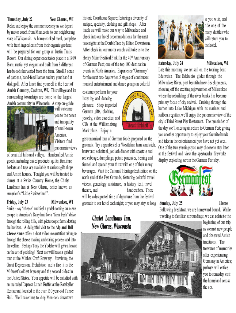 Thursday, July 22 New Glares, WI Relax and enjoy the summer scenery as we depart by motor coach from Minnesota to our neighboring state of Wisconsin. A home cooked meal, complete with fresh ingredients