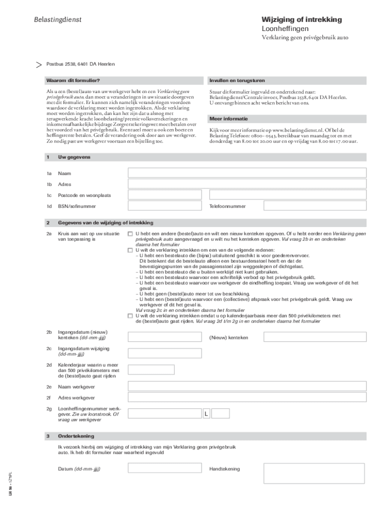 Wijziging of intrekking Loonheffingen123451Verklaring geen privgebruik autoPostbus 2538, 6401 DA Heerlen Waarom dit formulier?Invullen en terugsturenAls u een (bestel)auto van uw werkgever hebt en