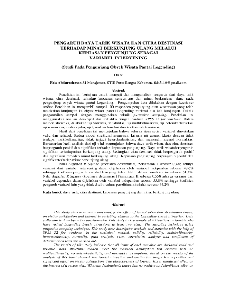 PENGARUH DAYA TARIK WISATA DAN CITRA DESTINASI TERHADAP MINAT BERKUNJUNG ULANG MELALUI KEPUASAN PENGUNJUNG SEBAGAI VARIABEL INTERVENING (Studi Pada Pengunjung Obyek Wisata Pantai Logending) Oleh: