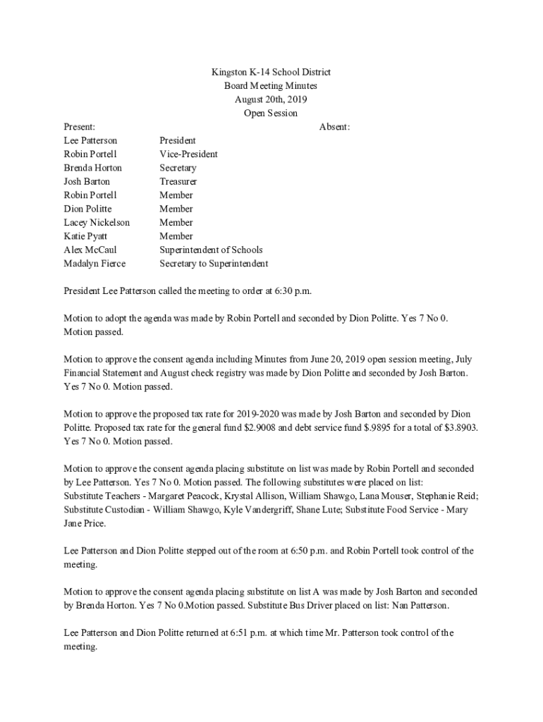 Present: Lee Patterson Robin Portell Brenda Horton Josh Barton Robin Portell Dion Politte Lacey Nickelson Katie Pyatt Alex McCaul Madalyn FierceKingston K14 School District Board Meeting Minutes August
