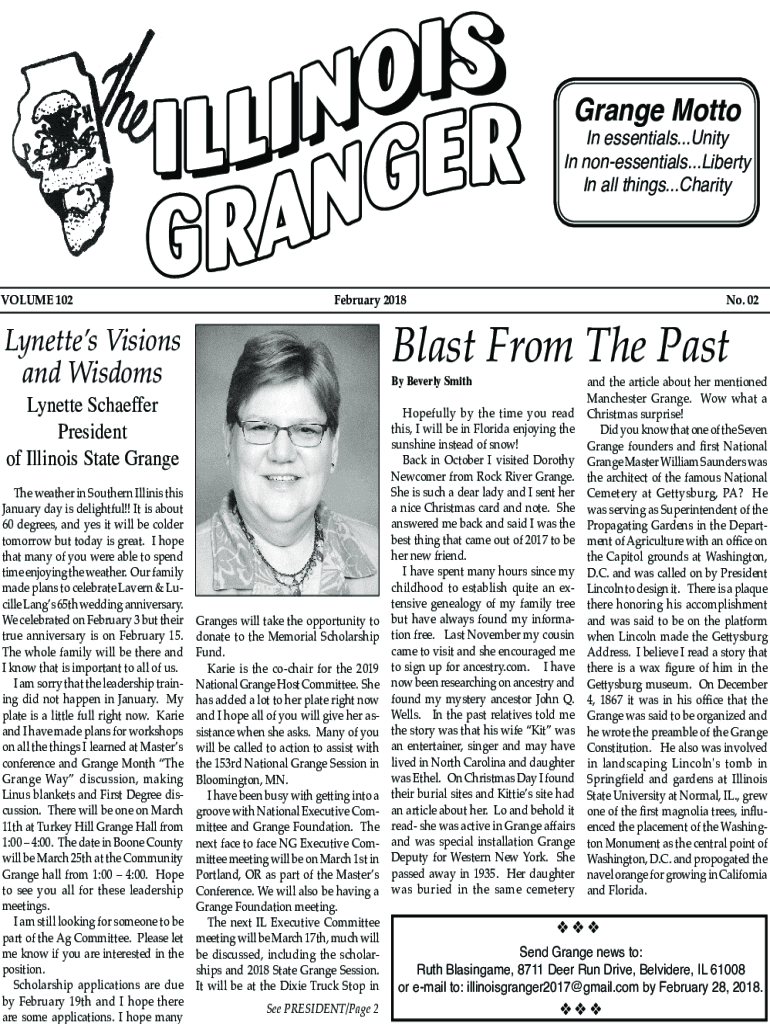 Grange MottoIn essentials...Unity In nonessentials...Liberty In all things...CharityVOLUME 102February 2018Lynettes Visions and WisdomsNo. 02Blast From The Past By Beverly SmithLynette Schaeffer President