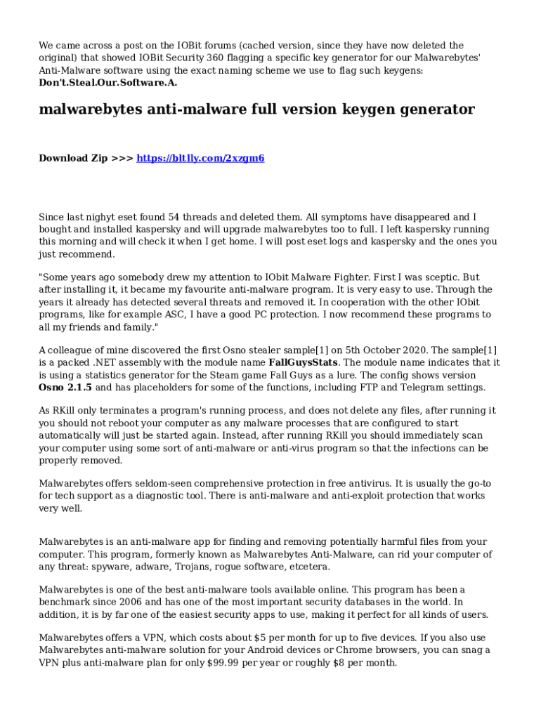 We came across a post on the IOBit forums (cached version, since they have now deleted the original) that showed IOBit Security 360 flagging a specific key generator for our Malwarebytes\' AntiMalware