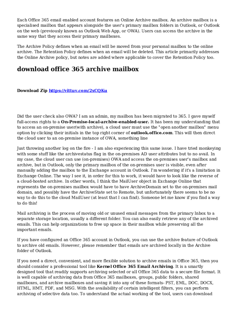 Each Office 365 email enabled account features an Online Archive mailbox. An archive mailbox is a specialised mailbox that appears alongside the user\'s primary mailbox folders in Outlook, or Outlook