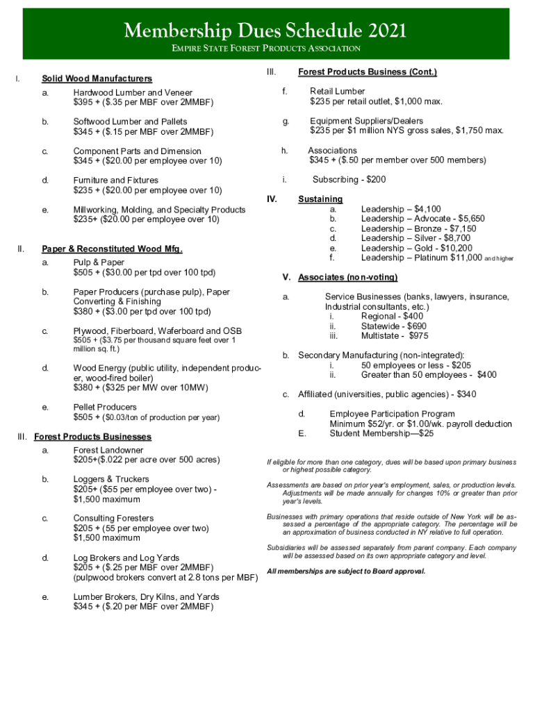 Membership Dues Schedule 2021 EMPIRE STATE FOREST PRODUCTS ASSOCIATION I.II.Solid Wood ManufacturersIII.Forest Products Business (Cont.)a.Hardwood Lumber and Veneer $395 + ($.35 per MBF over 2MMBF)f.Retail