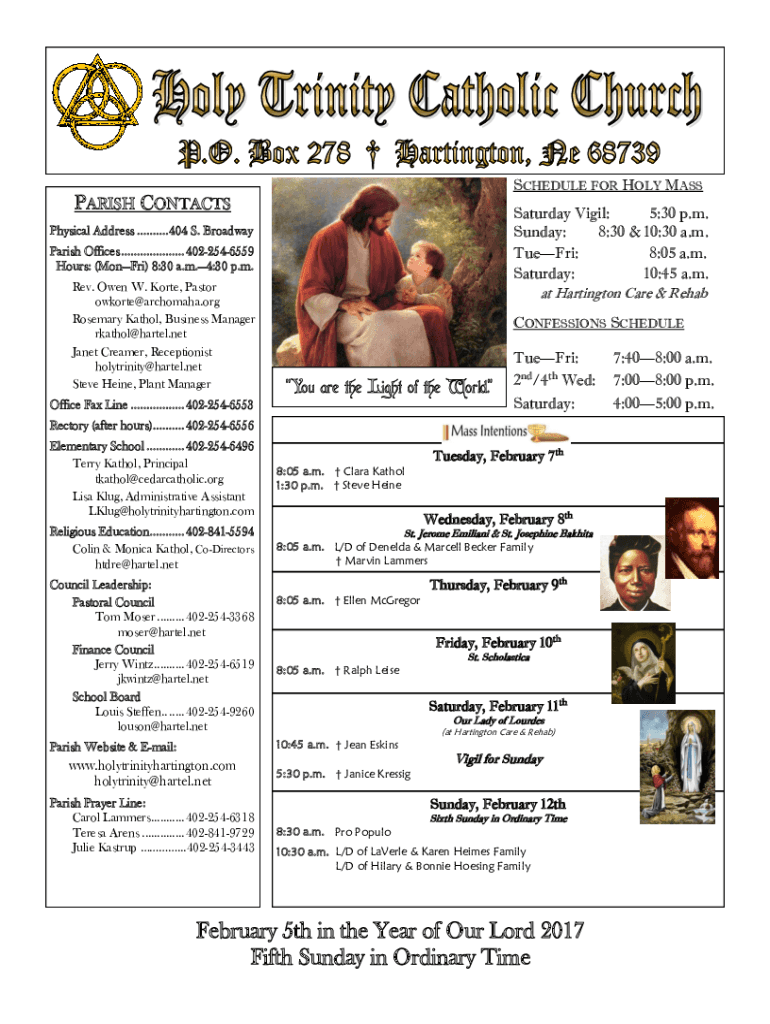 SCHEDULE FOR HOLY MASSPARISH CONTACTSSaturday Vigil: 5:30 p.m. Sunday: 8:30 & 10:30 a.m. TueFri: 8:05 a.m. Saturday: 10:45 a.m. at Hartington Care & RehabPhysical Address .......... 404 S. Broadway