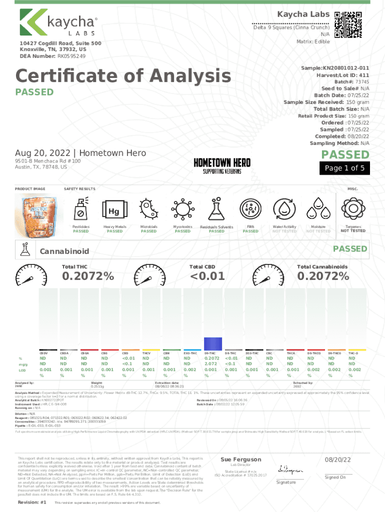 Kaycha Labs Delta 9 Squares (Cinna Crunch) N/A Matrix: Edible10427 Cogdill Road, Suite 500 Knoxville, TN, 37932, US DEA Number: RK0595249Certicate of AnalysisSample:KN20801012011 Harvest/Lot ID: 411