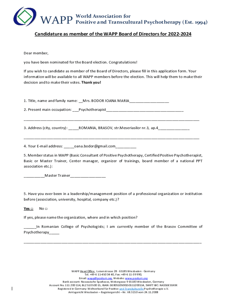 WAPPWorld Association for Positive and Transcultural Psychotherapy (Est. 1994)Candidature as member of the WAPP Board of Directors for 20222024Dear member, you have been nominated for the Board election.