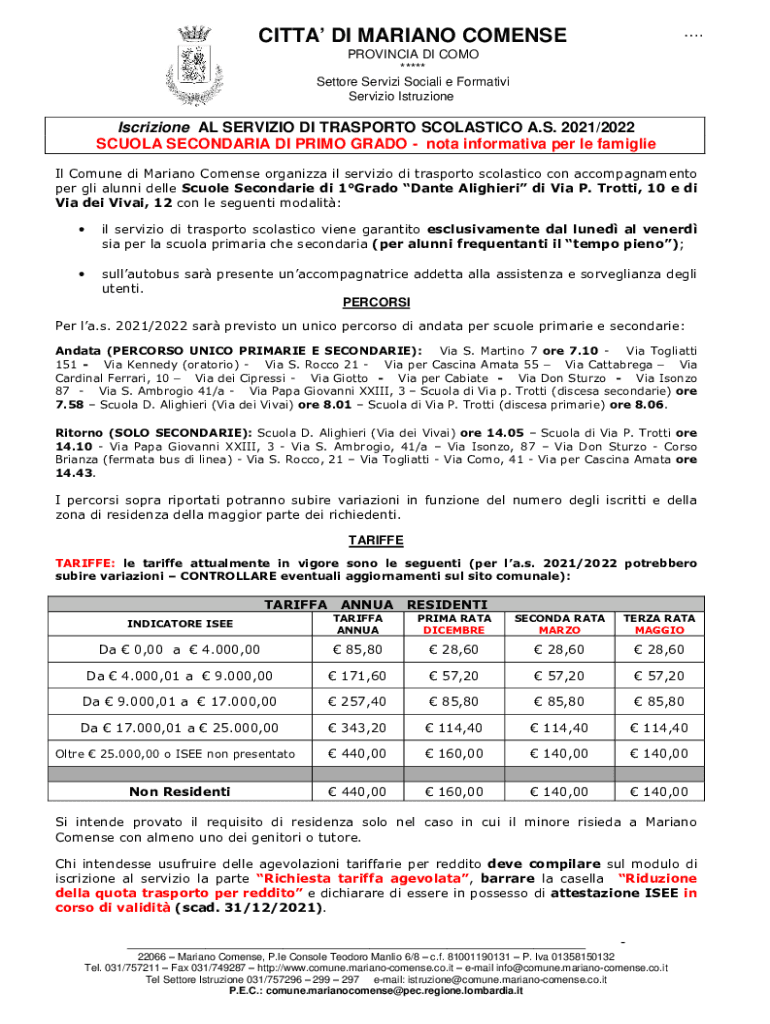 .CITTA DI MARIANO COMENSE PROVINCIA DI COMO ***** Settore Servizi Sociali e Formativi Servizio IstruzioneIscrizione AL SERVIZIO DI TRASPORTO SCOLASTICO A.S. 2021/2022 SCUOLA SECONDARIA DI PRIMO GRADO