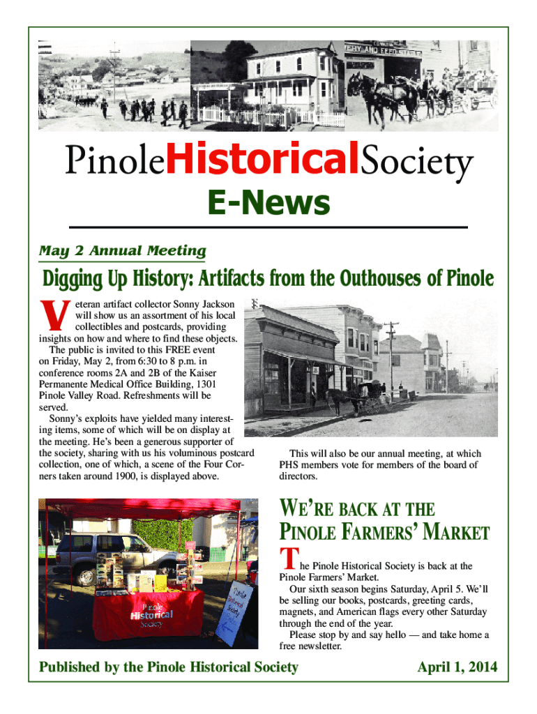 PinoleHistoricalSociety ENewsMay 2 Annual MeetingDigging Up History: Artifacts from the Outhouses of PinoleVeteran artifact collector Sonny Jackson will show us an assortment of his local collectibles