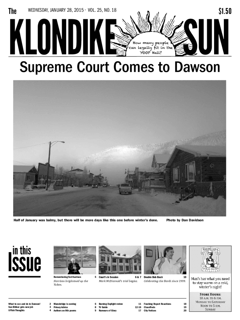 The$1.50Wednesday, JANUARY 28, 2015 Vol. 25, No. 18KLONDIKEHow many people can legally fit in the YOOP Hall?SUNSupreme Court Comes to DawsonHalf of January was balmy, but there will be more days like