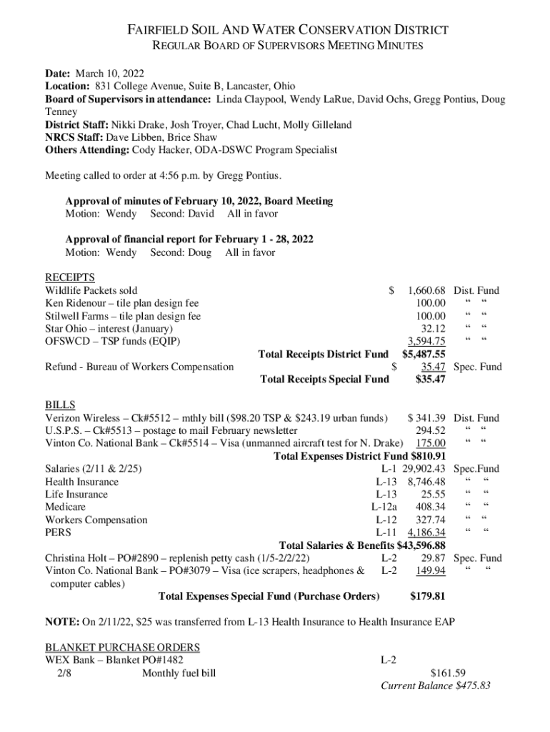 FAIRFIELD SOIL AND WATER CONSERVATION DISTRICT REGULAR BOARD OF SUPERVISORS MEETING MINUTES Date: March 10, 2022, Location: 831 College Avenue, Suite B, Lancaster, Ohio Board of Supervisors in attendance:
