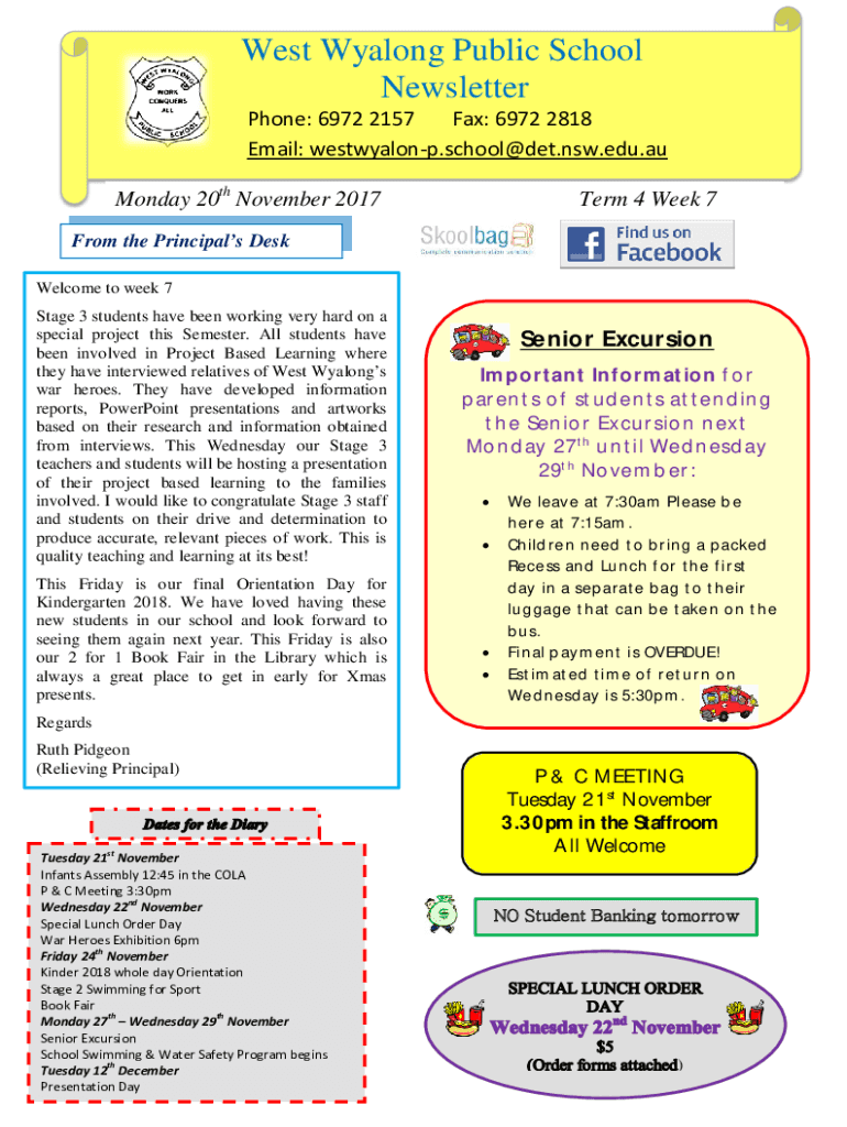 West Wyalong Public School Newsletter5``Phone: 6972 2157 Fax: 6972 2818 Email: westwyalonp.school@det.nsw.edu.au Monday 20th November 2017Term 4 Week 7From the Principals Desk Welcome to week 7 Stage