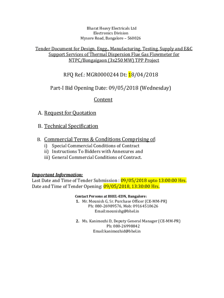 Bharat Heavy Electrical Electronics Division Mysore Road, Bangalore 560026Tender Document for Design, Egg., Manufacturing, Testing, Supply and Support Services of Thermal Dispersion Flue Gas Flow