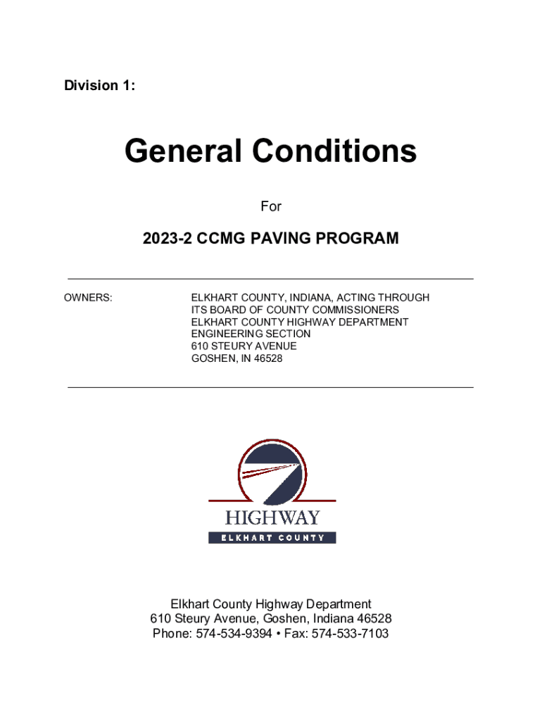 Division 1:General Conditions For20232 CMG PAVING PROGRAM ___ OWNERS:ELKHART COUNTY, INDIANA, ACTING THROUGH ITS BOARD OF COUNTY COMMISSIONERS ELKHART COUNTY HIGHWAY DEPARTMENT ENGINEERING SECTION