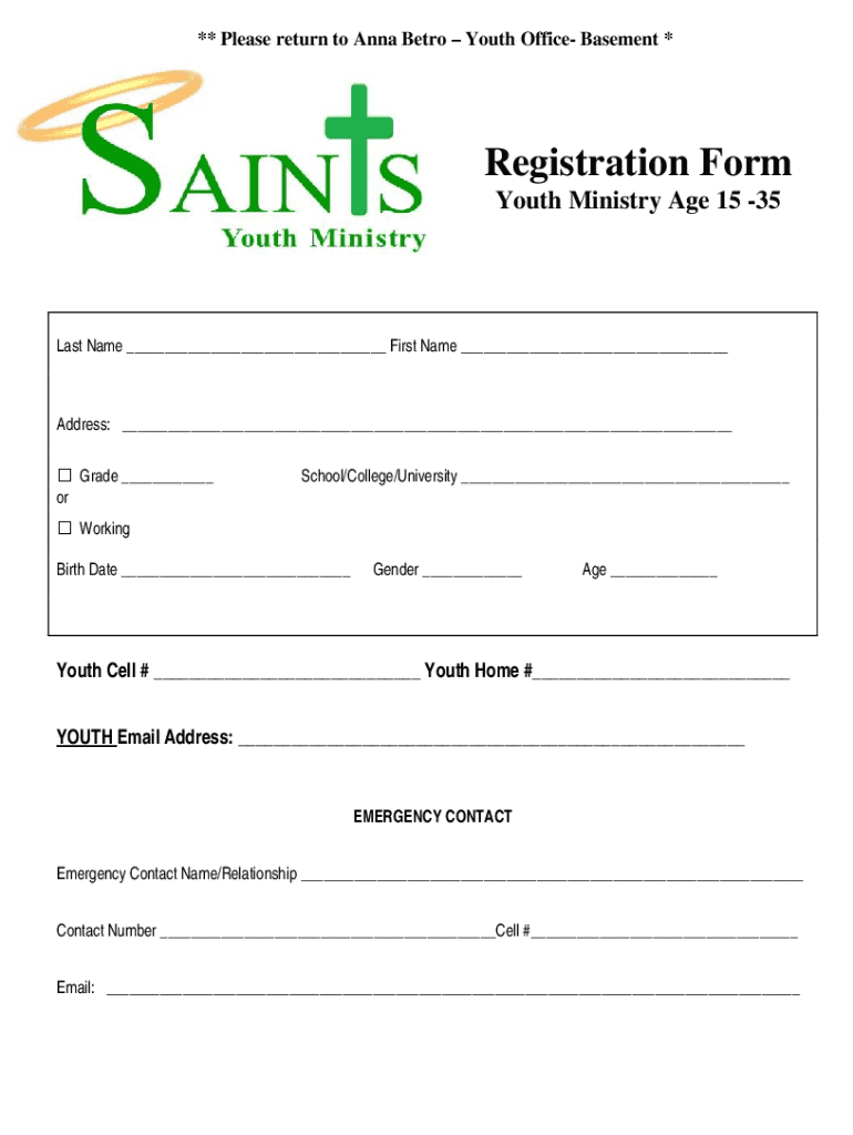 ** Please return to Anna Betro Youth Office Basement *Registration Form Youth Ministry Age 15 35Last Name ___ First Name ___Address: ___ Grade ___ orSchool/College/University ___ Working Birth Date