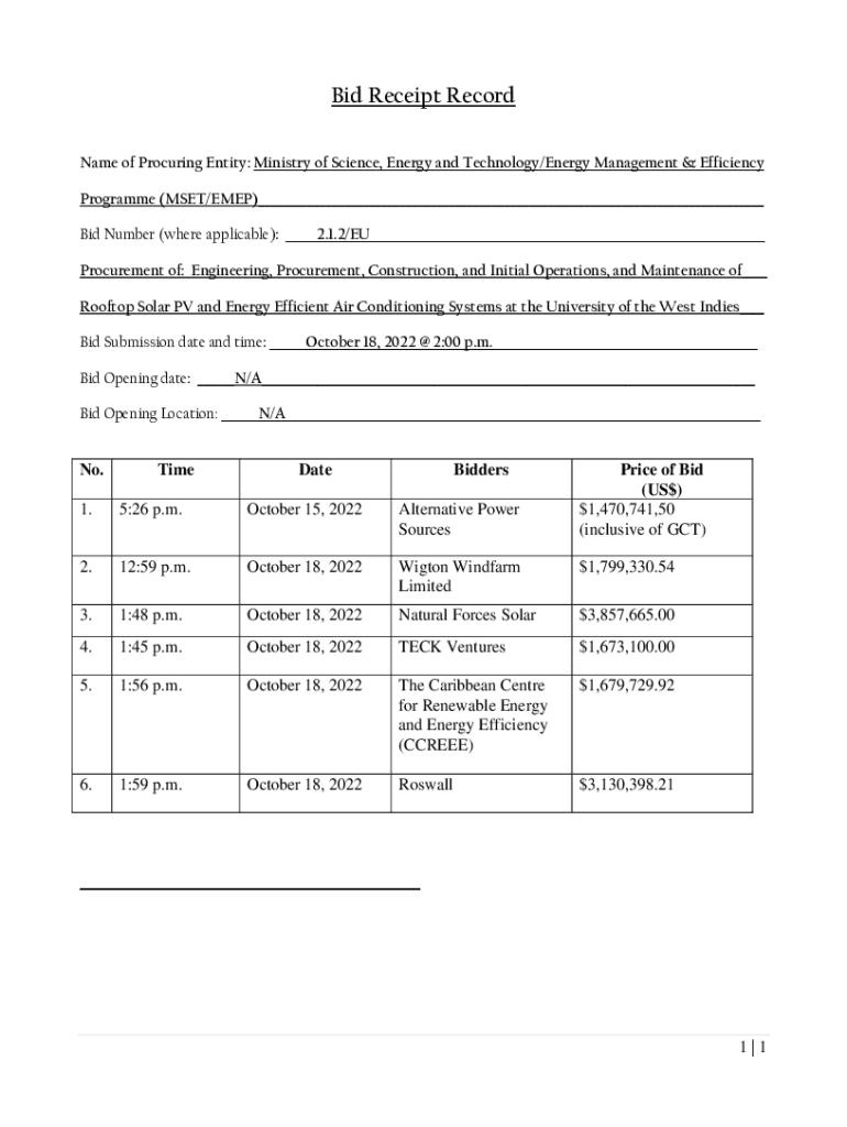 Bid Receipt Record Name of Procuring Entity: Ministry of Science, Energy and Technology/Energy Management & Efficiency Programme (MSET/EMEP)___ Bid Number (where applicable): ___2.1.2/EU______Procurement