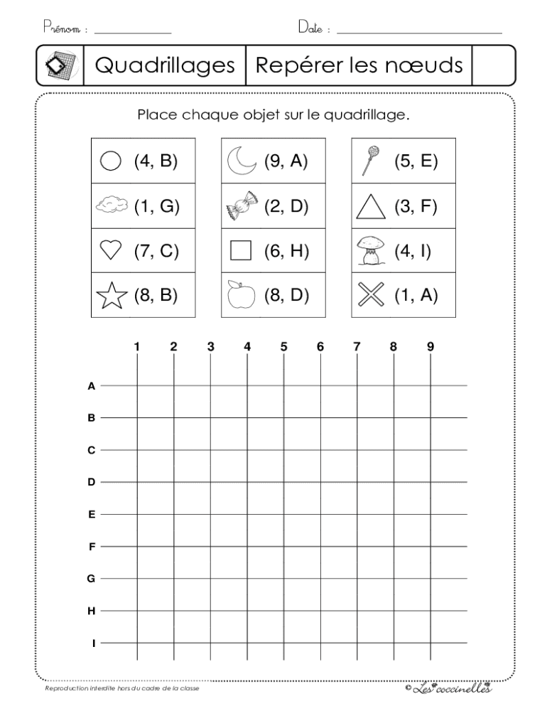 Prnom :___Date :___Quadrillages Reprer les nuds Place chaque objet sur le quadrillage.(4, B)(9, A)(5, E)(1, G)(2, D)(3, F)(7, C)(6, H)(4, I)(8, B)(8, D)(1, A)12A B C D E F G H IReproduction interdite