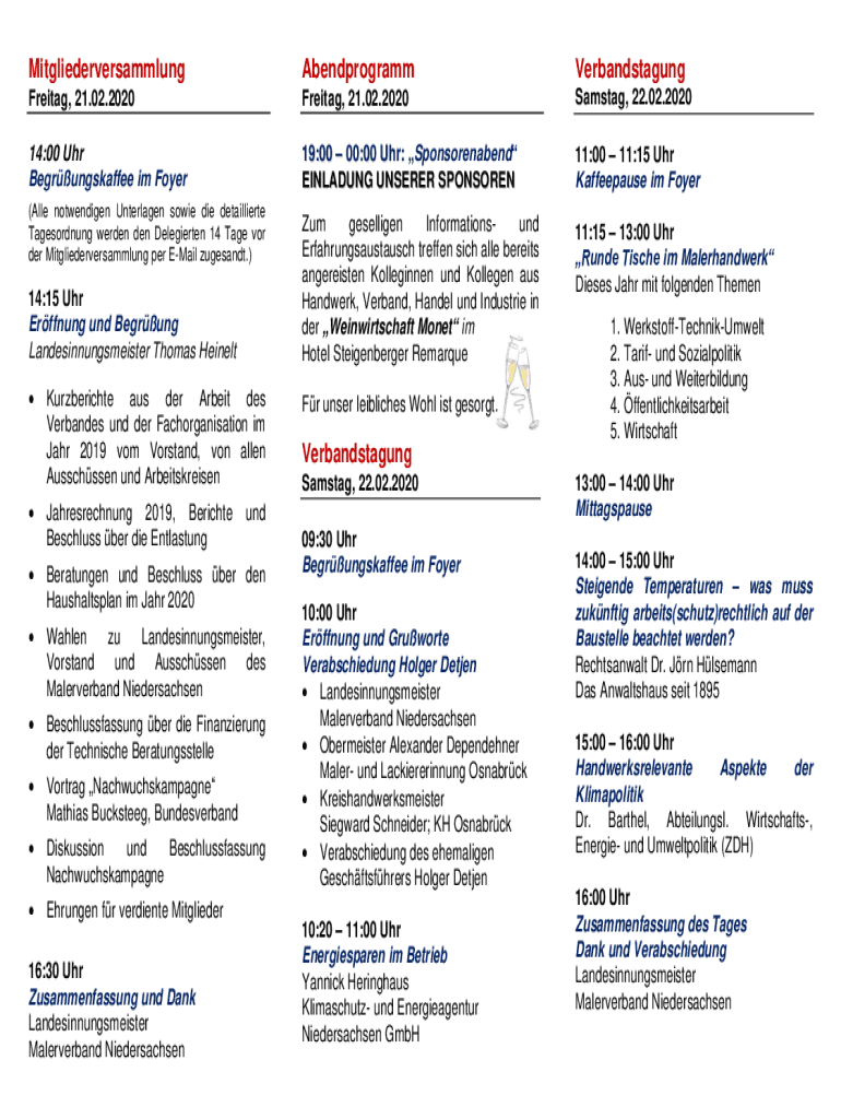 MitgliederversammlungAbendprogrammVerbandstagungFreitag, 21.02.2020Freitag, 21.02.2020Samstag, 22.02.202014:00 Uhr Begrungskaffee im Foyer19:00 00:00 Uhr: Sponsorenabend EINLADUNG UNSERER SPONSOREN11:00