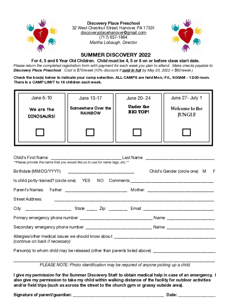 32 West Chestnut Street, Hanover, PA 17331discoveryplacehanover@gmail.com(717) 6371864Martha Laugh, DirectorSUMMER DISCOVERY 2022For 4, 5 and 6-Year-Old Children. Child must