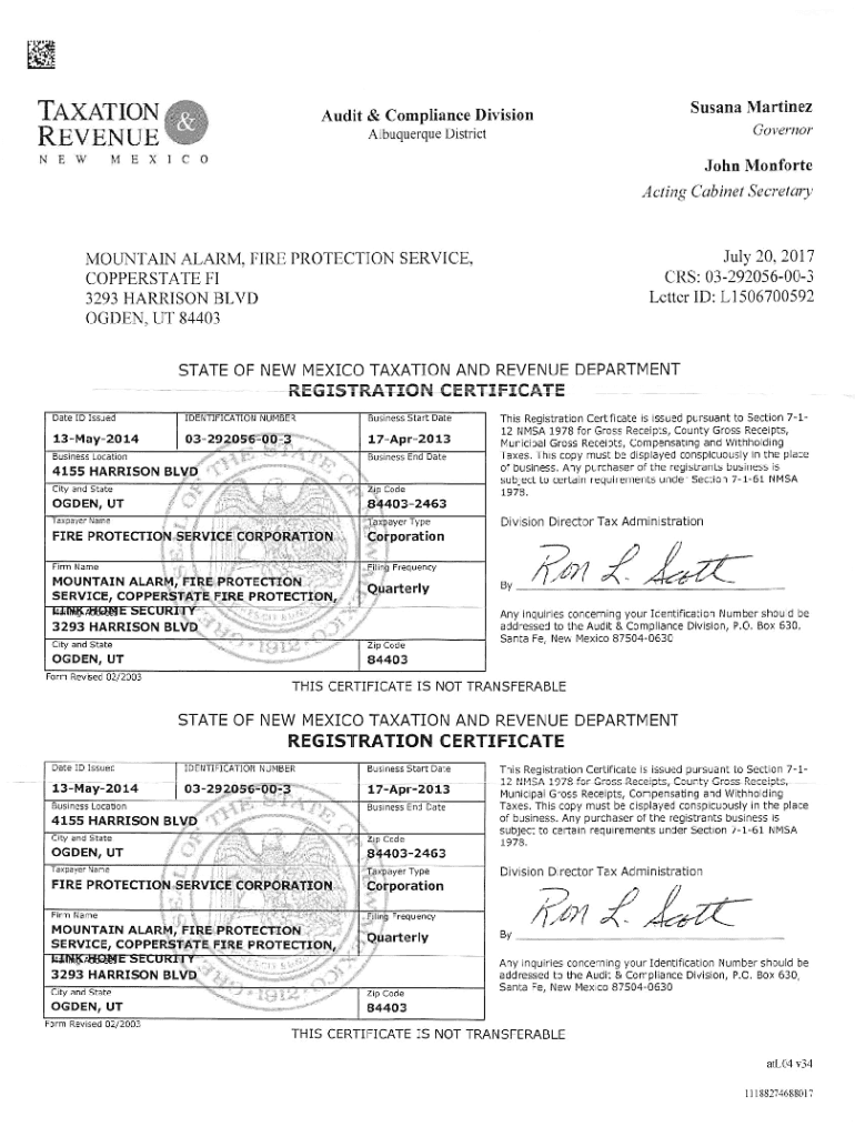 NEWMEXICOJohn MonforteActing Cabinet Secretary July 20, 2017MOUNTAIN ALARM, FIRE PROTECTION SERVICE, CRS: 03292056003