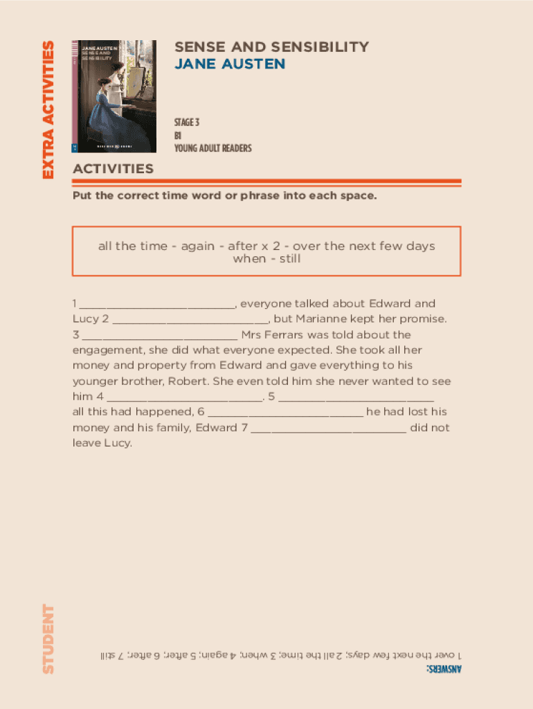 EXTRA ACTIVITIESSTAGE 3areful but Marianne is not. They both meet the man of their dreams, hey find true happiness? Sense and Sensibility is Jane Austens classic wo sisters who have a lot to learn