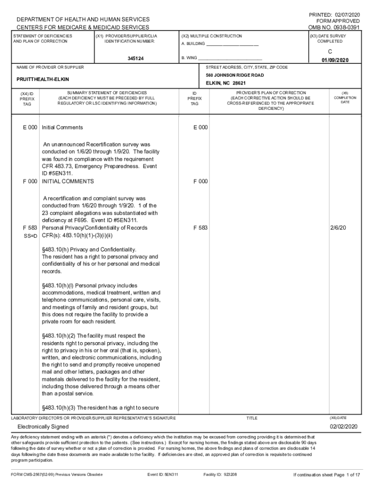 PRINTED: 02/07/2020 FORM APPROVEDDEPARTMENT OF HEALTH AND HUMAN SERVICES CENTERS FOR MEDICARE & MEDICAID SERVICES STATEMENT OF DEFICIENCIES AND PLAN OF CORRECTION(X1) PROVIDER/SUPPLIER/CLIA IDENTIFICATION