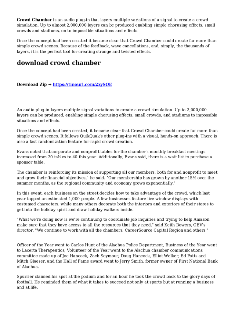 Crowd Chamber is an audio plugin that layers multiple variations of a signal to create a crowd simulation. Up to almost 2,000,000 layers can be produced enabling simple chorusing effects, small crowds