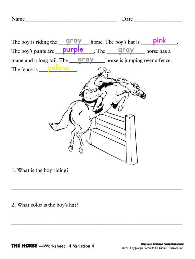 Name___Date___The boy is riding the ___ horse. The boys hat is ___. The boys pants are ___. The ___ horse has a mane and a long tail. The ___ horse is jumping over a fence. The fence is ___.1. What