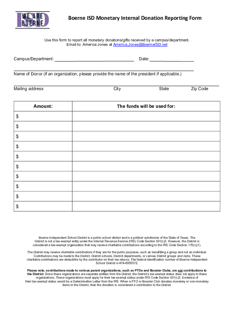 Borne ISD Monetary Internal Donation Reporting Forms this form to report all monetary donations/gifts received by a campus/department.