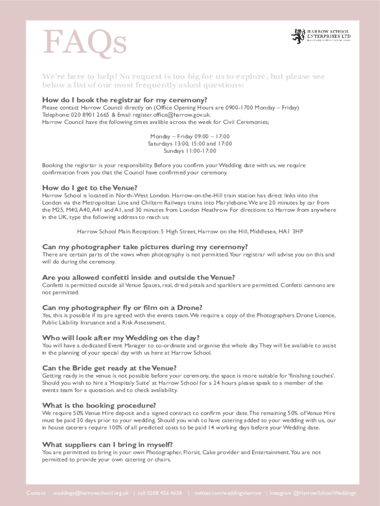 FAQs Were here to help! No request is too big for us to explore, but please see below a list of our most frequently asked questions: How do I book the registrar for my ceremony?Please contact Harrow