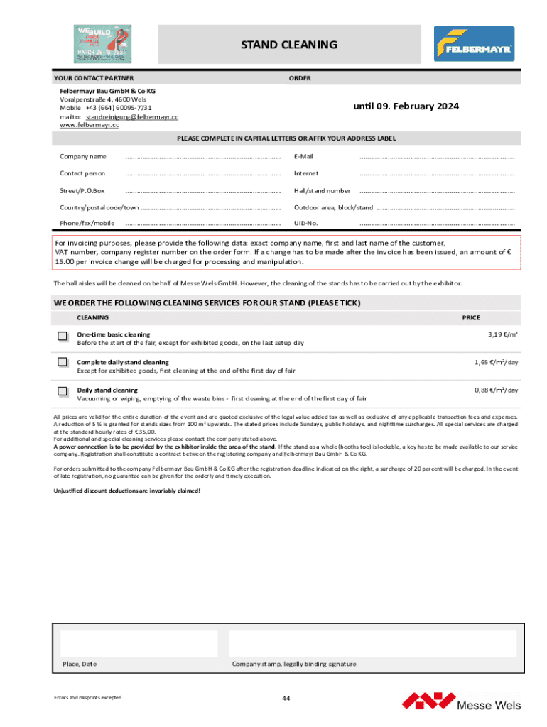 STAND CLEANING YOUR CONTACT PARTNERORDERFelbermayr Bau GmbH & Co KG Voralpenstrae 4, 4600 Wels Mobile +43 (664) 600957731 mailto: standreinigung@felbermayr.cc www.felbermayr.ccun l 09. February 2024PLEASE